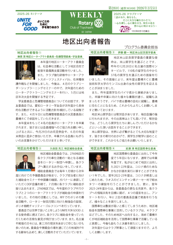 | 11月9日 | 2025-26年度RI第2760地区 地区大会及び 第16回(通算3646)例会 | ⇒閲覧する(3.3MB) |